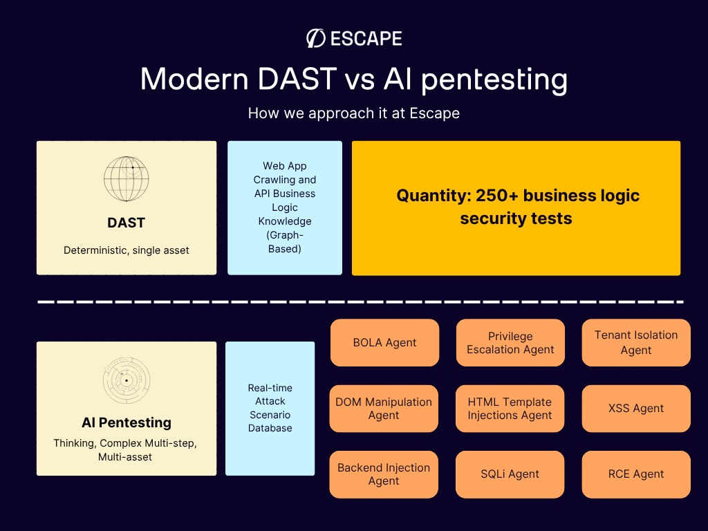 DAST and AI pentesting are complementary, not competing. DAST automatically tests running applications for individual vulnerabilities (XSS, SQLi, BOLA, IDOR) on every code change — it's continuous and integrated into CI/CD. AI pentesting goes further by chaining multiple vulnerabilities into multi-step attack paths, simulating how a real attacker would move through your system. Think of DAST as your continuous security gate and AI pentesting as periodic deep-dive offensive assessments. Modern platforms like Escape are combining both capabilities: business-logic-aware DAST for every build plus agentic pentesting that reasons about complex attack chains.