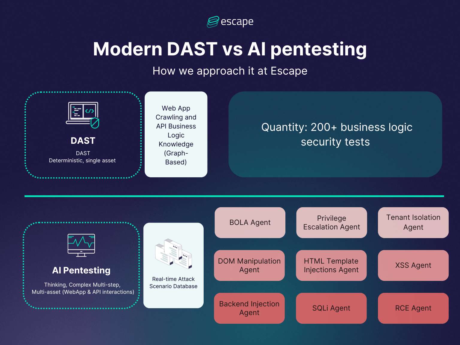 At Escape, we've always communicating on how DAST should evolve from legacy solutions like Qualys DAST or Rapid7 DAST to modern approaches. Now, the evolution from modern DAST to AI-powered automated pentesting isn't about replacing DAST. Our goal was to build on top of a sophisticated DAST architecture to enable pentesting-level capabilities.