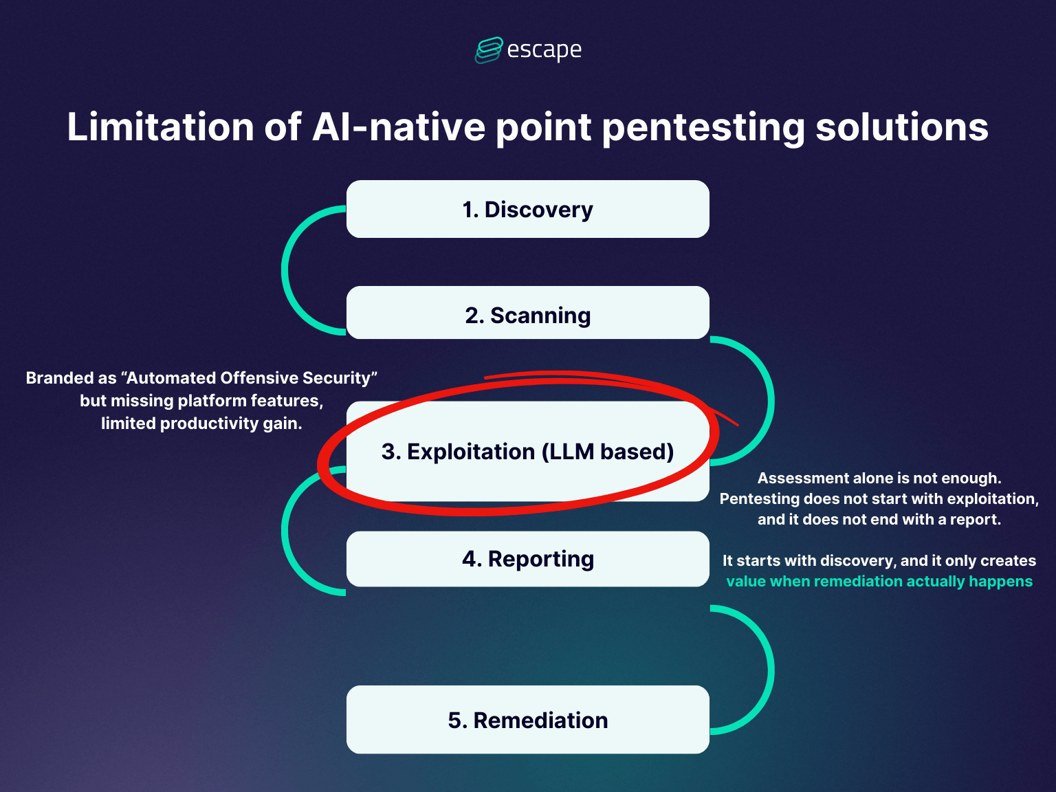 When we look at how pentesting is approached, essentially, it is not a tool. It’s a process. This is why it's important to consider the limitations of AI-native point pentesting solutions that focus mainly on exploitation: