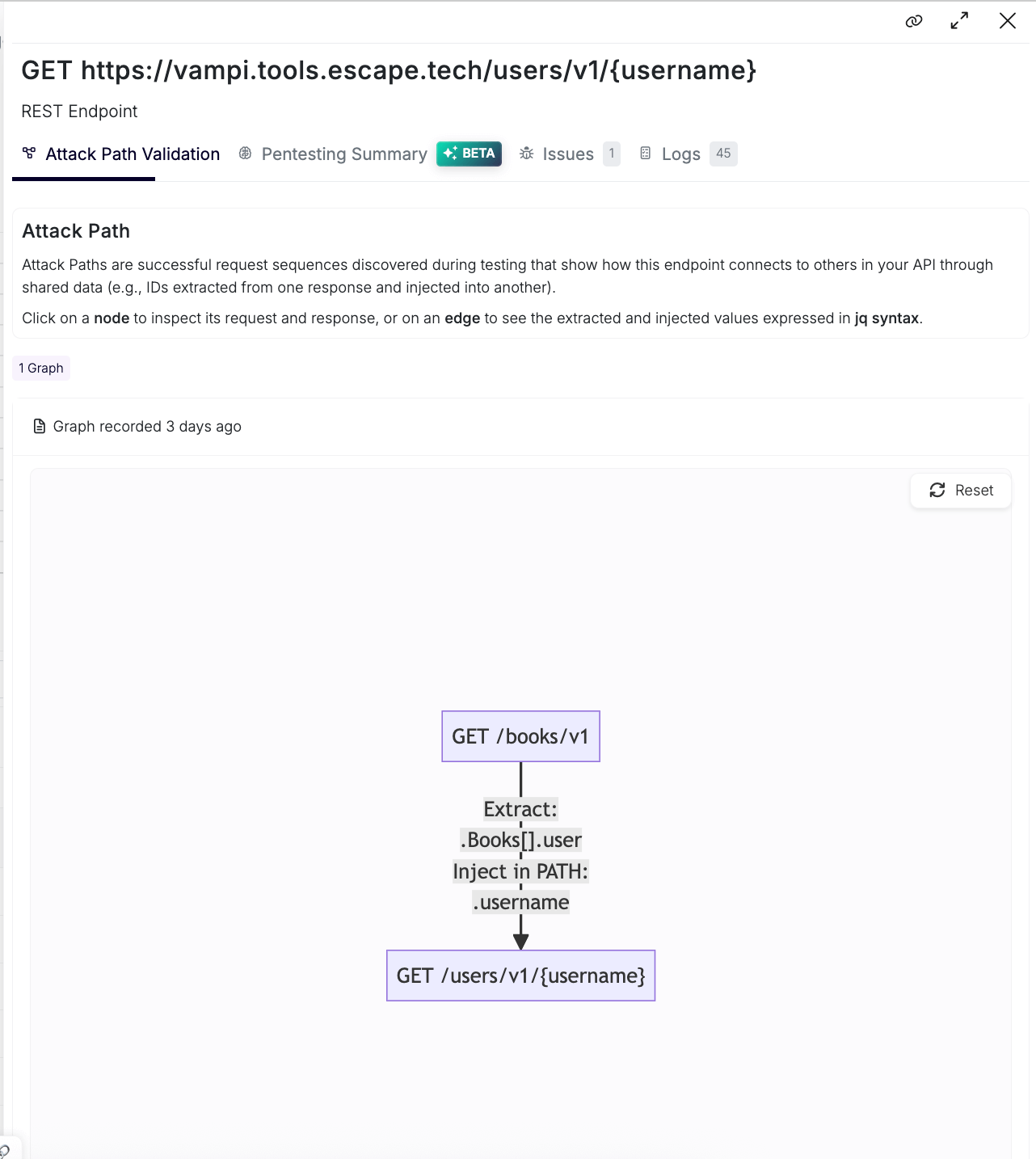 - Attack Path Validation graph that gives you visibility into Escape’s API exploration engine and helps you ensure that everything found by Escape is interpreted in the correct way and that all the input is valid.