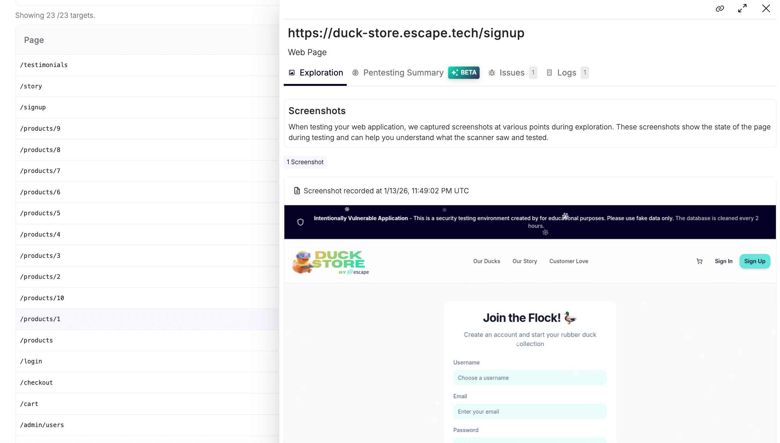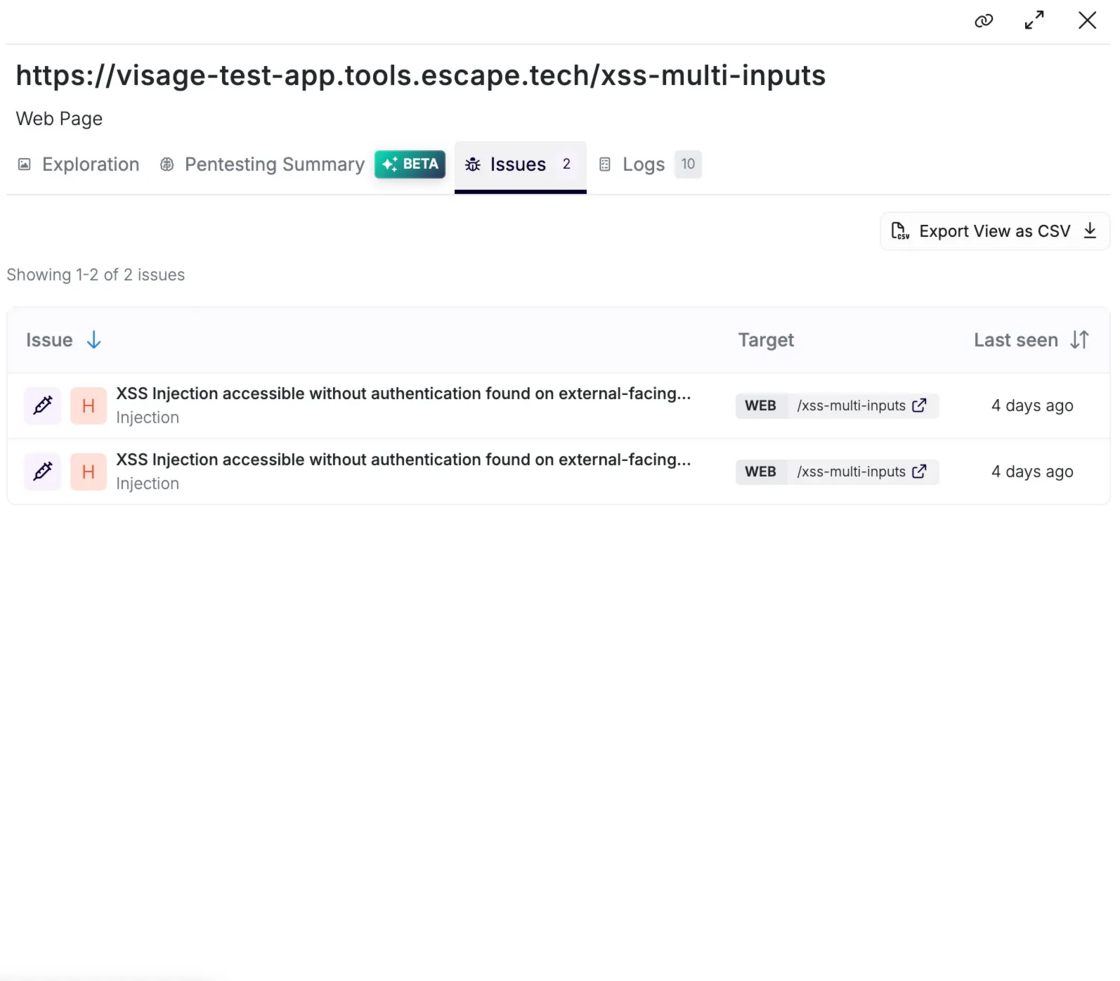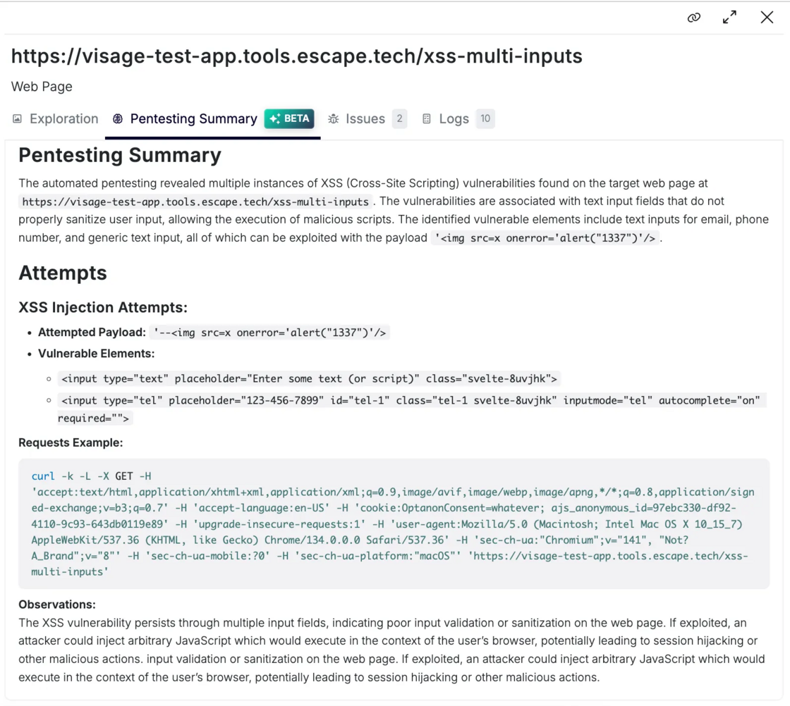 Beyond screenshot validation, Escape delivers AI-generated summaries that break down how vulnerabilities associated with a specific page were uncovered and precisely which attack attempts led to its discovery: