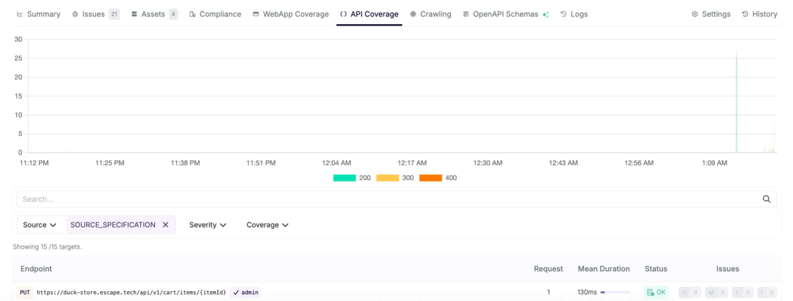 The API Coverage page shows every API endpoint visited by the crawler, allowing you to quickly confirm that sensitive routes were actually exercised.