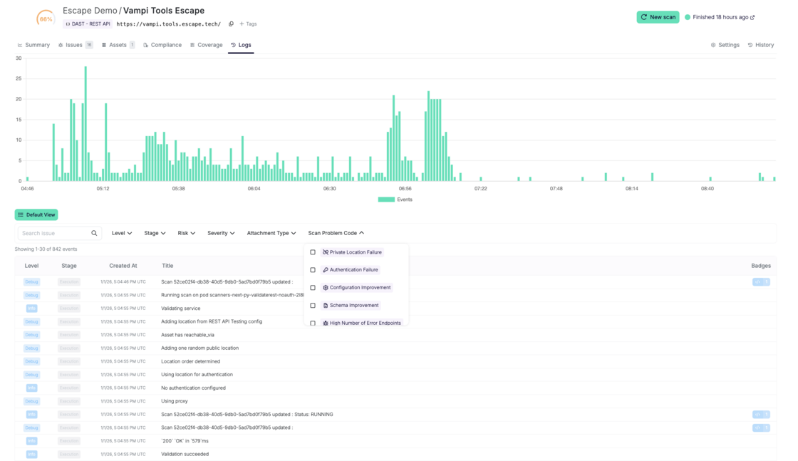 Escape’s improved Logs page gives you a complete, chronological view of everything that happens during a scan — and, crucially, why it happens.