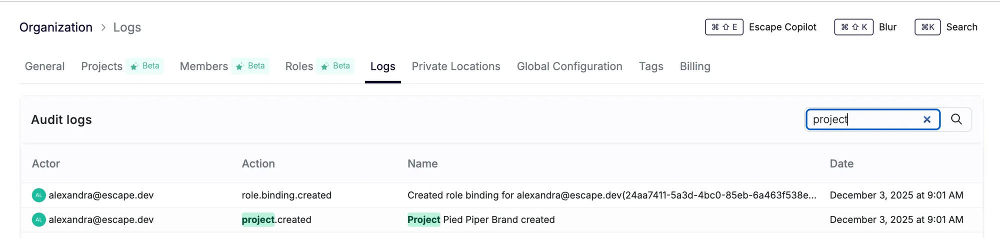 - Critical operations happening on projects (creating, editing, deleting) are audited and can be viewed in the audit logs page: