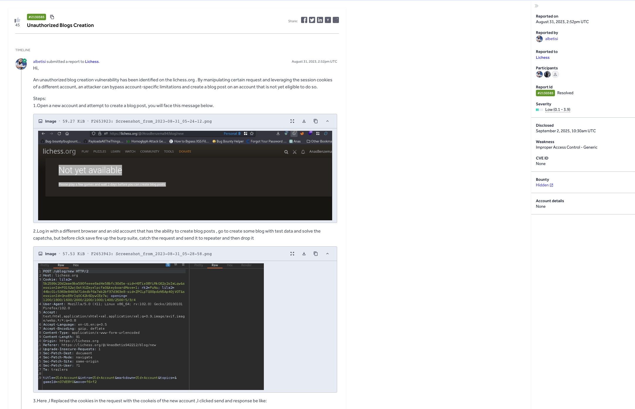According to HackerOne's report 2130385, Lichess.org contained a privilege escalation vulnerability that allowed newly created accounts to bypass eligibility restrictions and create blog posts, a feature reserved for established accounts.
