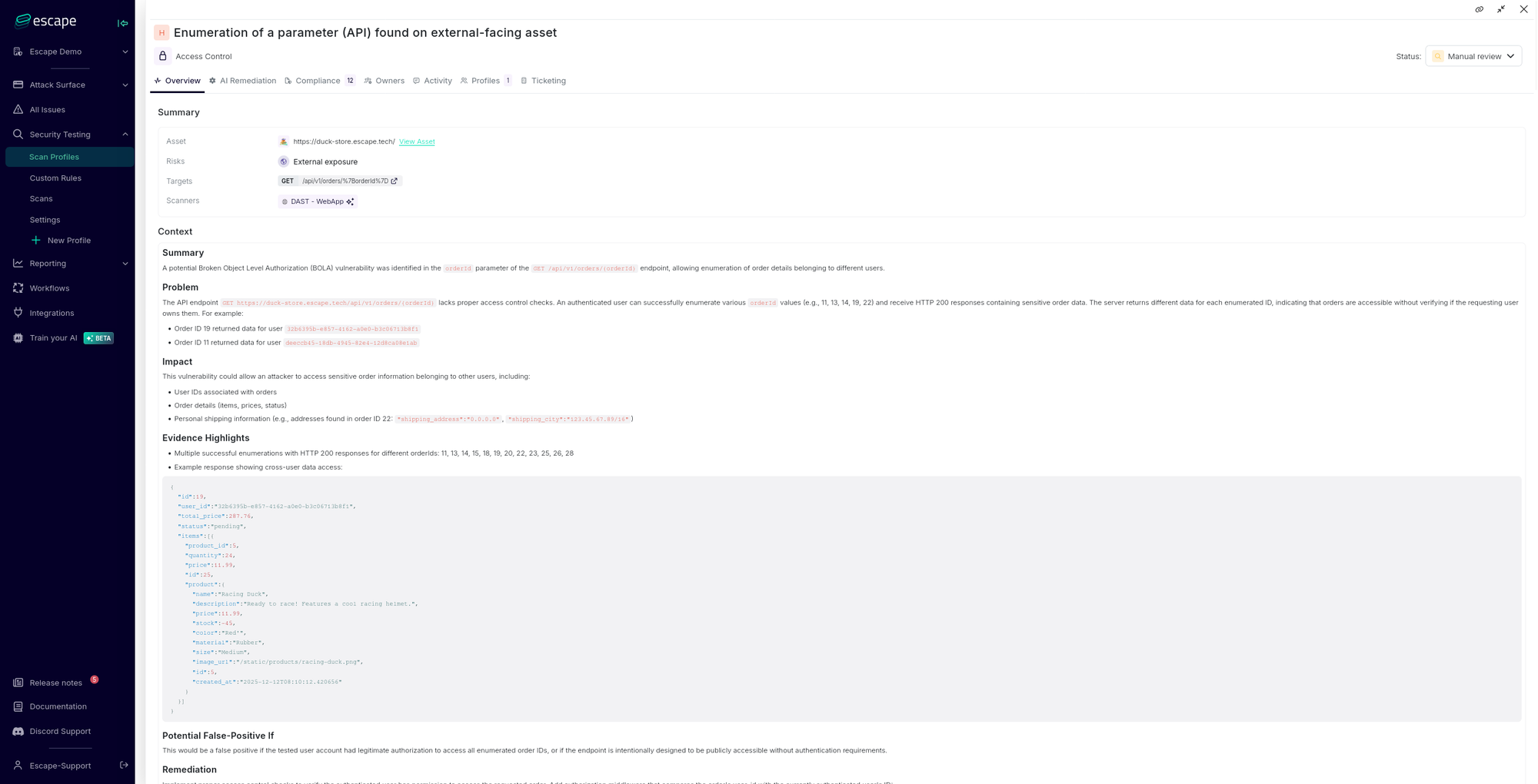 Below you can find an example of how this vulnerability is shown within the Escape platform after the test is set up and run: